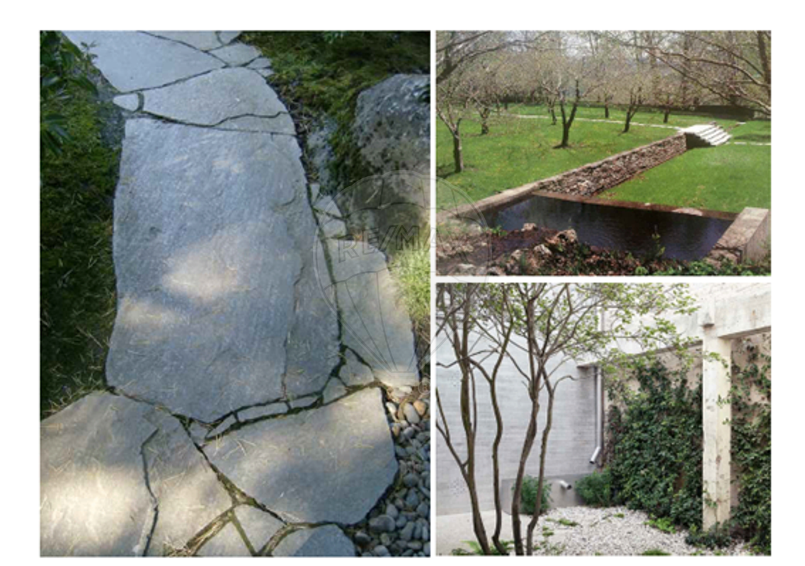 privados da casa. No piso térreo, através de desníveis suaves e meio piso, encontra-se a sala de estar com duplo pé-direito – o coração da casa –, em articulação com a cozinha e o escritório. Todos estes espaços beneficiam de luz natural abundante e ligação visual ou direta ao exterior, favorecendo uma vivência integrada com o jardim, a piscina, o tanque de água e a horta. Ainda neste piso, existe uma zona de entrada com vestíbulo, hall e uma instalação sanitária de apoio.